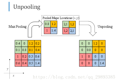 池化操作,以max-pooling为例,是在对一个感受野的区间内,只保留最大值,例如图左边。以这个二维坐标,绿色区域中,最大值0.8在x=2,y=1的位置,黄色区域中1.2在x=1,y=2的位置。