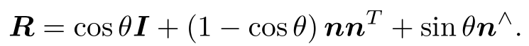 旋转向量就是李代数。剩下的问题是,旋转向量和旋转矩阵之间是如何转换的呢?假设有一个旋转轴为 n,角度为 θ 的旋转,显然,它对应的旋转向量为 θn。由旋转向量到旋转矩阵的过程由罗德里格斯公式(Rodrigues’s Formula )表明,由于推导过程比较复杂,我们不作描述,只给出转换的结果 :