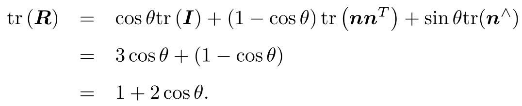 符号∧是向量到反对称的转换符。反之,我们也可以计算从一个旋转矩阵到旋转向量的转换。对于转角 θ,有(因为这里n为单位向量):