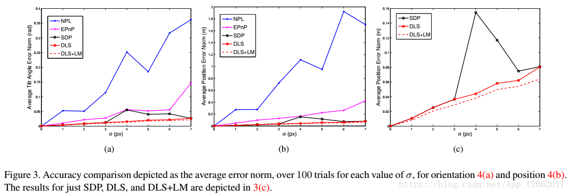作者对比了NPL,SDP,EPnP,DLS,DLS-LM等算法,点的分布视角45°*45°,并模拟了高斯噪声。效果如下: