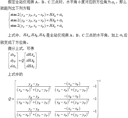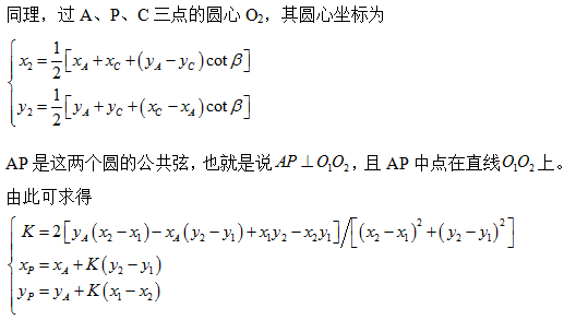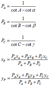 如下图所示,已知A、B、C三点的坐标,通过测量三个角度α、β、γ即可求出这三个角度顶点P的坐标。此即为后方交会。