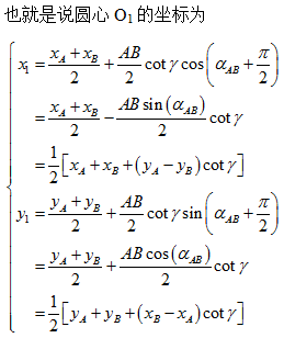 void HJ2(double xA,double yA,double HAa ,double xB,double yB,double HAb ,double xC,double yC,double HAc ,double*XP,double*YP) { double pi_2= 1.5707963267948966192313216916398; double ctg = 0.0; ctg = tan(pi_2 - (HAb - HAa)); double x1 = 0.5 * (xA + xB + (yA - yB) * ctg); double y1 = 0.5 * (yA + yB + (xB - xA) * ctg); ctg = tan(pi_2 - (HAc - HAa)); double x2 = 0.5 * (xA + xC + (yA - yC) * ctg); double y2 = 0.5 * (yA + yC + (xC - xA) * ctg); double k = 2.0*(yA*(x2-x1)+xA*(y1-y2)+x1*y2-x2*y1) / ((x2-x1)*(x2-x1)+(y2-y1)*(y2-y1)); if(XP) { *XP = xA + k * (y2 - y1); } if(YP) { *YP = yA + k * (x1 - x2); } } |