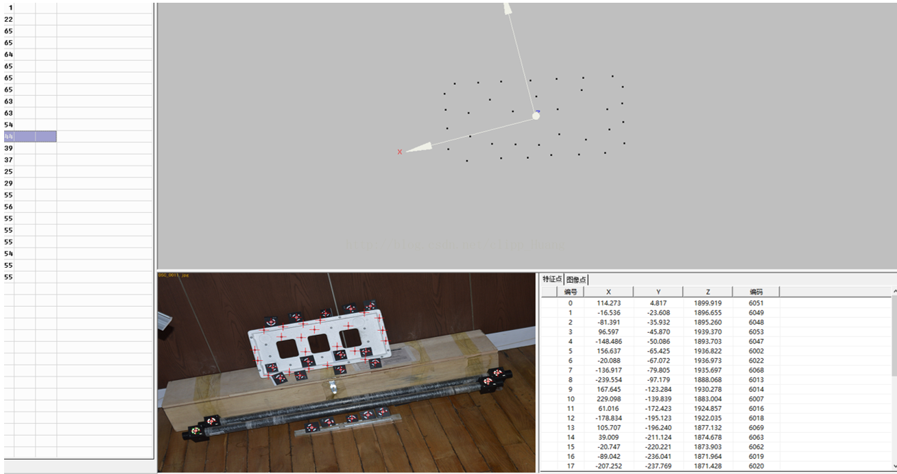 三维重建的效果如图-1所示,这里选的是一个比较小的物体方便测试,实际上可以测量像汽车那么大的物体,主要的作用还是配合三维扫描的,因为重建处理的全局三维点可以作为拼接的三维特征点来用,这样在三维扫描的时候就不需要一幅一幅的去拼接了。里面的主要技术包括了编码标记点的检测、相机的自标定、三维定向和重建、以及光束法平差优化,这些我会在后续博客里面进行介绍。