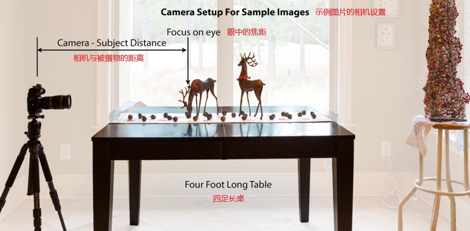 现在我们来看看一些如何改变给定场景的景深的例子。在其他一切之前,我想向你展示一下我拍这篇文章中例程图片的设置。希望这能让你更深入地了解照片,并更好地了解我拍摄的物体之间的距离。为了改变相机与被摄体的距离,我将三脚架移近/远离道具。所有测试图像都使用相同的相机(Nikon D500)拍摄。