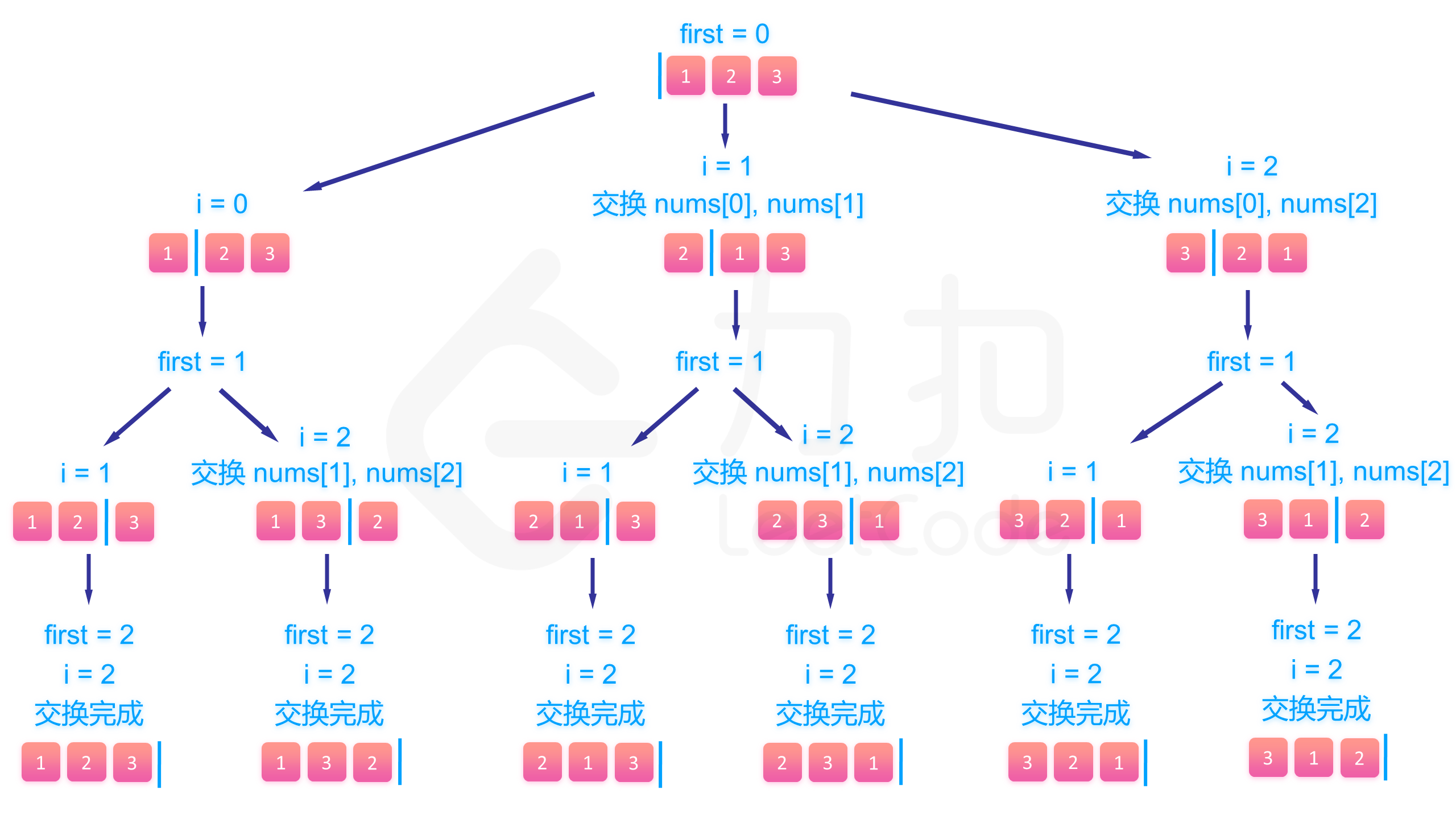 - 假设已经填到第 first 个位置,那么nums 数组中 [0,first−1] 是已填过的数的集合,[first,n−1] 是待填的数的集合。