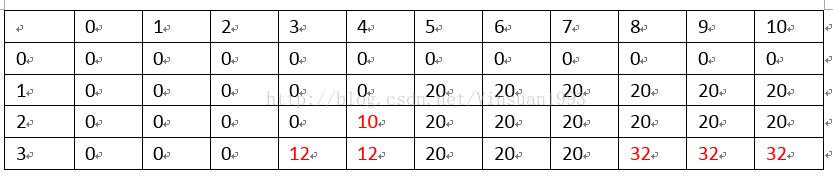 d[2][4]=10即前2个宝石(0号、1号宝石)装到剩余体积为4的背包里能达到的最大价值显然是10,但如果d[2][5]=20,即前2个宝石(0号、1号宝石)装到剩余体积为5的背包里能达到的最大价值显然是20;