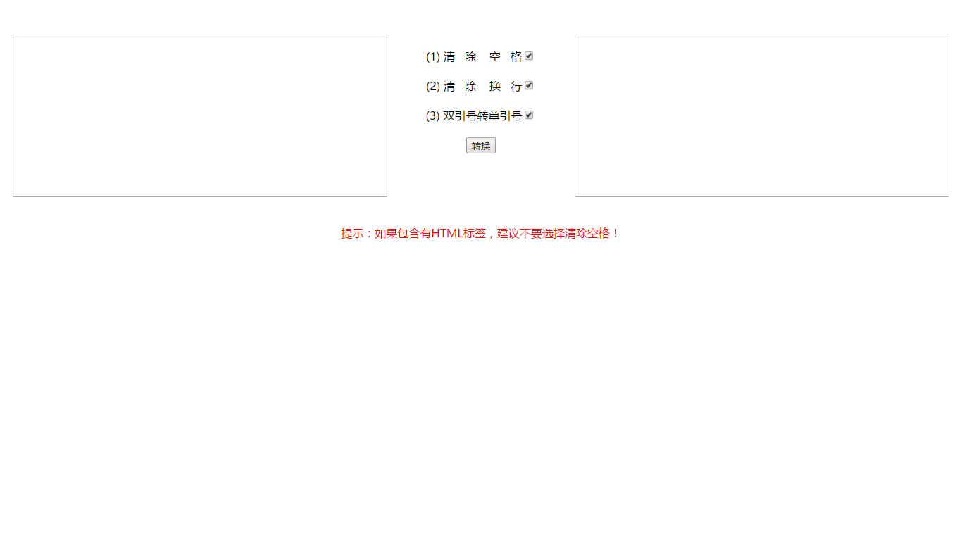 1 <!DOCTYPE> 2 <html> 3 <head> 4 <meta charset="utf-8"> 5 <title>清除字符串的空格和双引号</title> 6 <style type="text/css"> 7 textarea{ 8 padding:10px; 9 font-size:18px; 10 width:100%; 11 resize:none; 12 } 13 .main{ 14 padding:40px 10px; 15 clear:both; 16 overflow:hidden; 17 } 18 19 .main .left{ 20 float:left; 21 width:40%; 22 } 23 .main .center{ 24 25 float:left; 26 width:20%; 27 28 text-align:center; 29 30 } 31 .main .right{ 32 float:right; 33 width:40%; 34 } 35 .footer{ 36 text-align:center; 37 color:red; 38 } 39 </style> 40 </head> 41 <body> 42 <div class="main"> 43 <div class="left"> 44 <textarea rows="10" id="ta1"></textarea> 45 </div> 46 47 <!--【中部开始】--> 48 <div class="center"> 49 <br> 50 <label for="ck1">(1) 清 除 空 格</label><input type="checkbox" id="ck1" checked="checked"><br><br> 51 <label for="ck2">(2) 清 除 换 行</label><input type="checkbox" id="ck2" checked="checked"><br><br> 52 <label for="ck3">(3) 双引号转单引号</label><input type="checkbox" id="ck3" checked="checked"><br> 53 <br> 54 <button onclick="Run()">转换</button> 55 </div> 56 <!--【中部结束】--> 57 58 <div class="right"> 59 <textarea rows="10" id="ta2"></textarea> 60 </div> 61 </div> 62 <div class="footer">提示:如果包含有HTML标签,建议不要选择清除空格!</div> 63 64 <script type="text/javascript"> 65 function Run(){ 66 var ta1 = document.getElementById("ta1"); 67 var ta2 = document.getElementById("ta2"); 68 var ck1 = document.getElementById("ck1"); 69 var ck2 = document.getElementById("ck2"); 70 var ck3 = document.getElementById("ck3"); 71 var rst = ta1.value; 72 73 if(ck1.checked){ 74 //alert(1); 75 rst = Trim(rst); 76 } 77 78 if(ck2.checked){ 79 rst = ClearBr(rst); 80 } 81 82 if(ck3.checked){ 83 rst = Change(rst); 84 } 85 //rst += "+++"; 86 ta2.value = rst; 87 ta2.select(); 88 document.execCommand("Copy"); // 执行浏览器复制命令 89 alert("执行完成,可以直接粘贴"); 90 91 } 92 93 //去除空格 94 function Trim(str){ 95 return str.replace(/s+/g,""); 96 } 97 98 //去除换行 99 function ClearBr(str) { 100 //str = str.replace(/</?.+?>/g,""); 101 str = str.replace(/[rn]/g, ""); 102 return str; 103 } 104 function Change(str){ 105 return str.replace(/"/g, "'"); 106 } 107 </script> 108 </body> 109 </html>