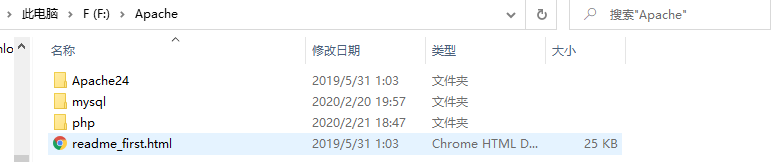 1.将zip包解压到合适的位置,例如“F:Apache“(mysql和php文件是后来添加的)