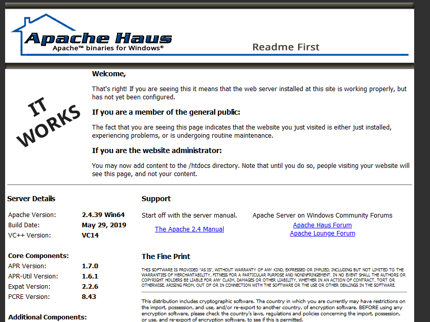 6执行命令“ httpd.exe -k start ”启动服务(命令行启动服务),如果没有错误提示,在浏览器中输入http://127.0.0.1:8080或者http://localhost:8080将显示下图