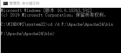 4.以管理员身份打开cmd, 执行命令“ cd /d F:ApacheApache24bin "