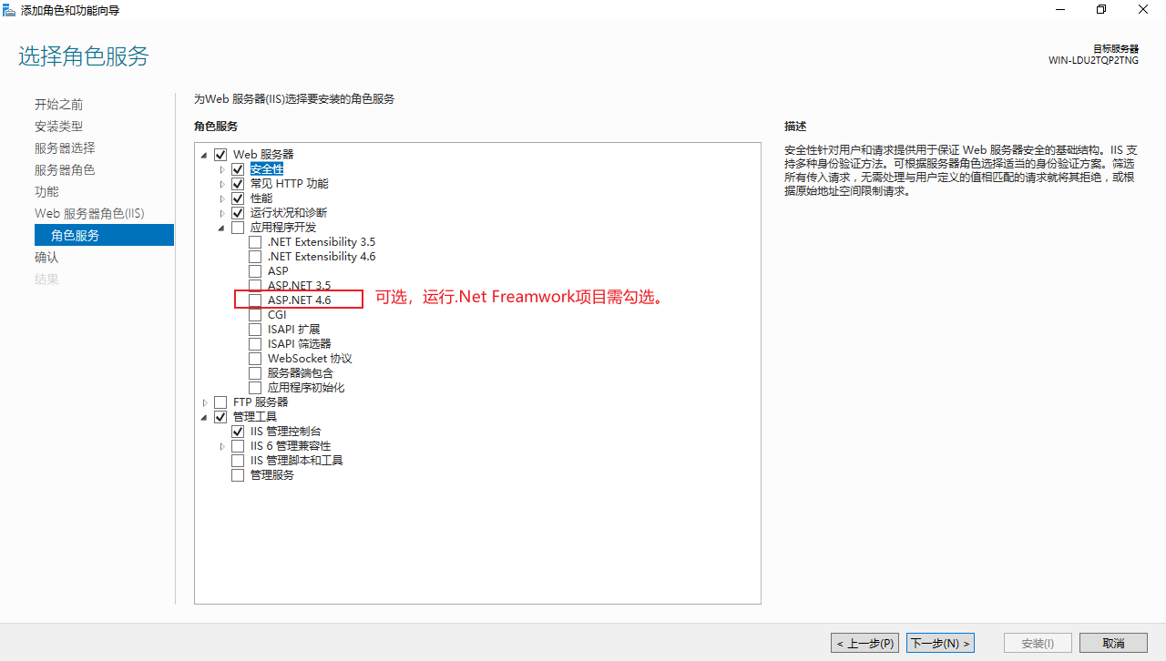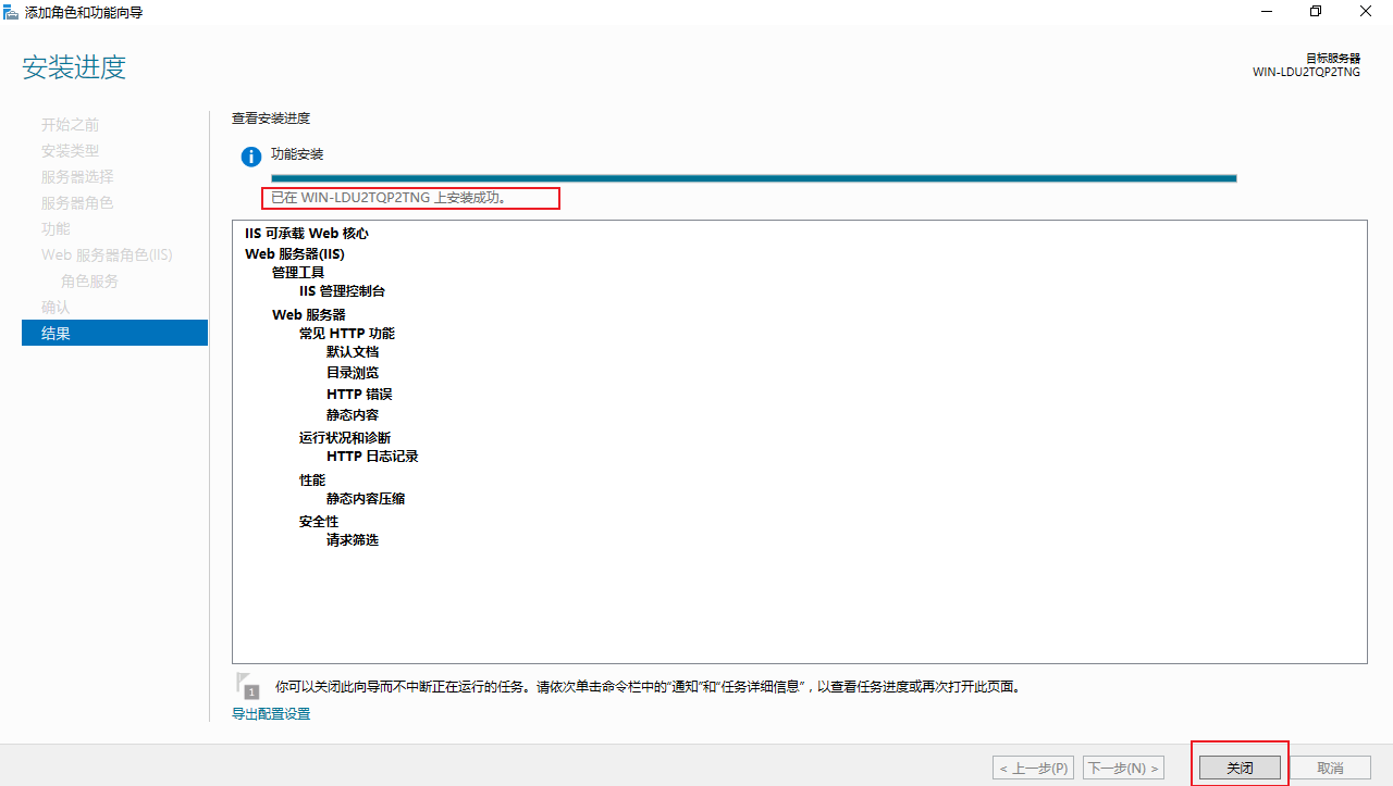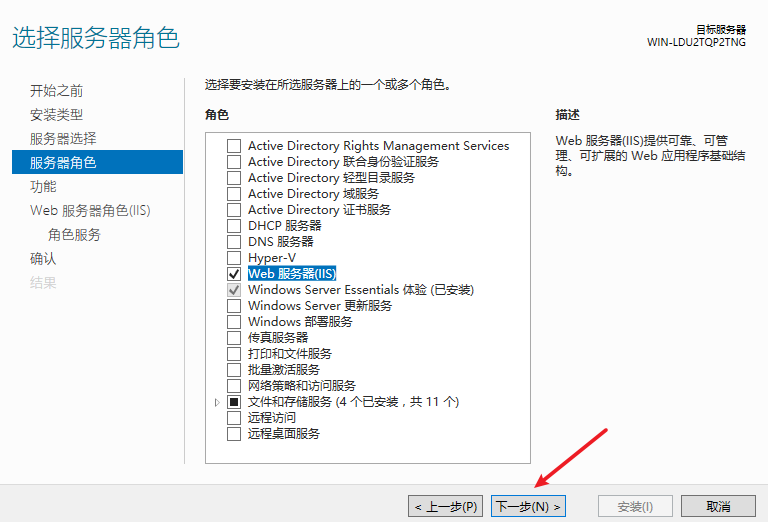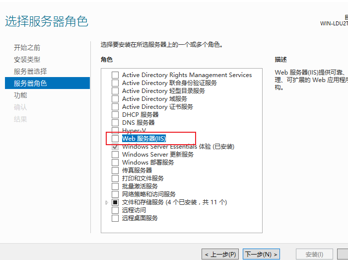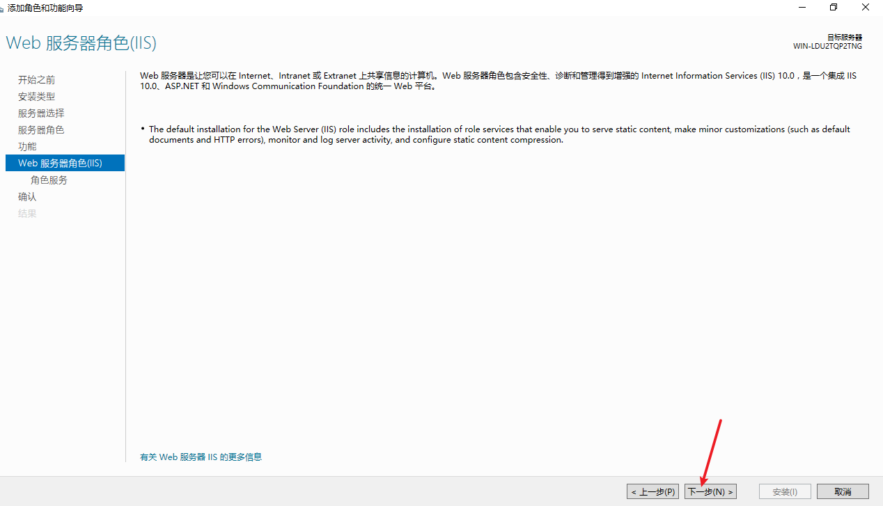 点击【下一步】,选择【安装】,开始安装IIS服务。