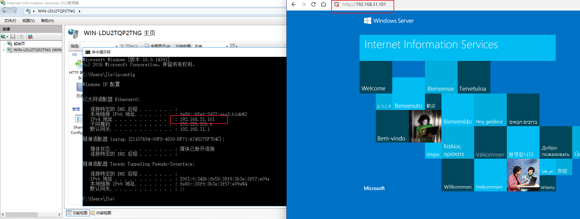 至此,IIS服务就已经安装好了。可访问服务器的IP地址就可以看到默认的欢迎页了。