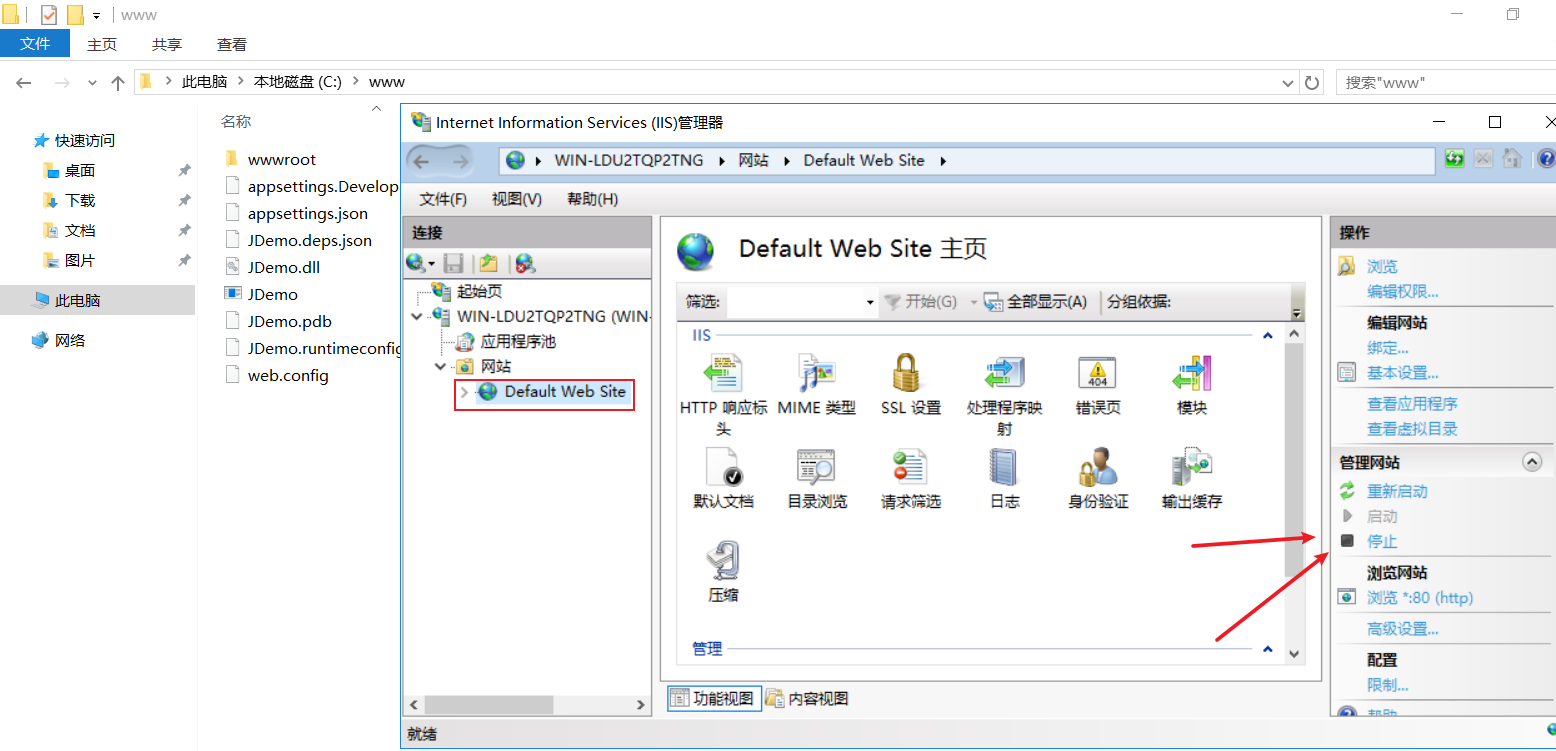 打开【IIS管理器】,将【Default Web Site】网站停止。因为如果不停止,稍后部署的程序也会用到80端口,会造成端口号冲突。
