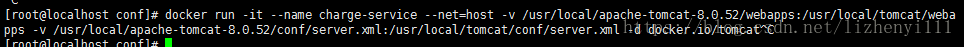 命令:docker run -it --name charge-service --net=host -v /usr/local/apache-tomcat-8.0.52/webapps:/usr/local/tomcat/webapps -v /usr/local/apache-tomcat-8.0.52/conf/server.xml:/usr/local/tomcat/conf/server.xml -d docker.io/tomcat