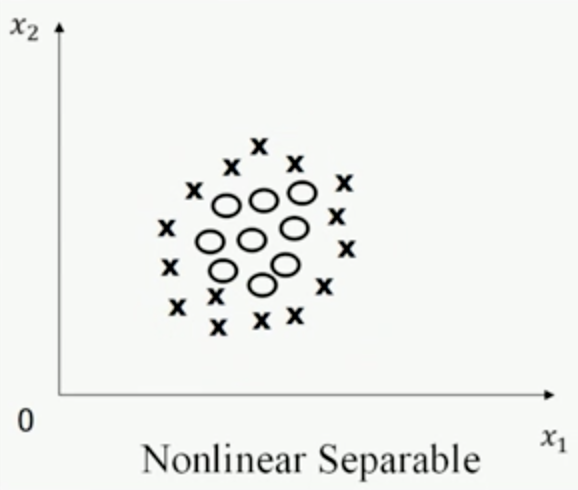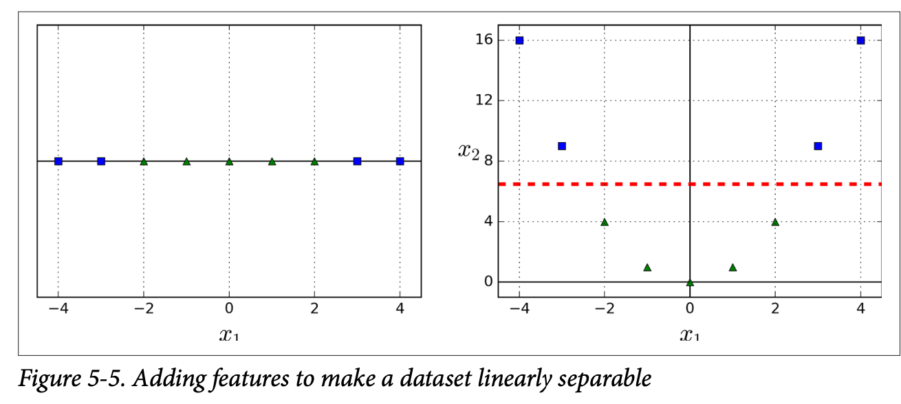例如:下面对数据集在只有x1维度时是线性不可分的,当从x1映射到(x1, x1^2)时,就变成线性可分了。
