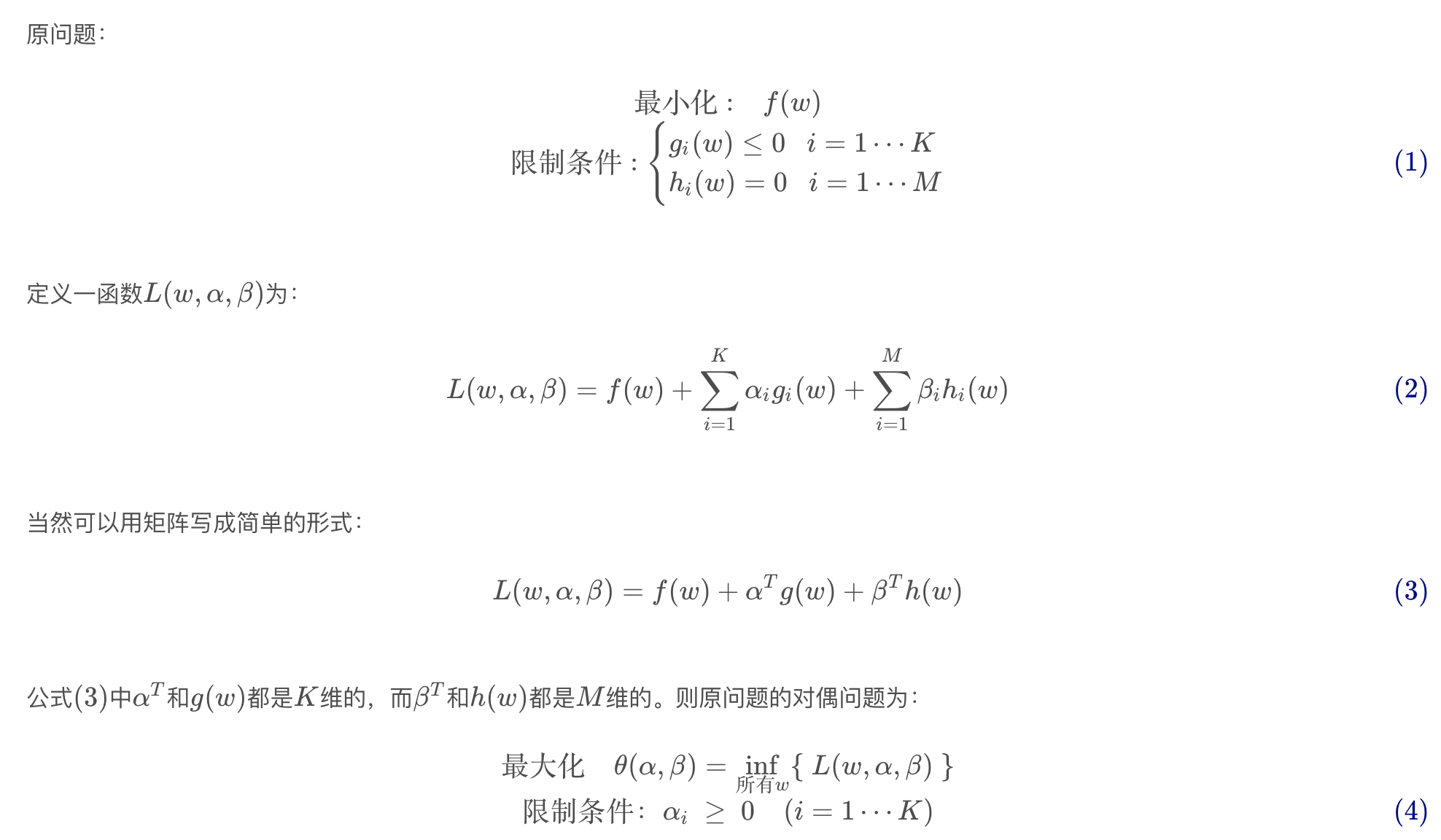 这个和上一节提到的原问题转换为对偶问题的原问题限制条件有一些区别,接下来,我们将原问题转换为上一节原问题的形式。