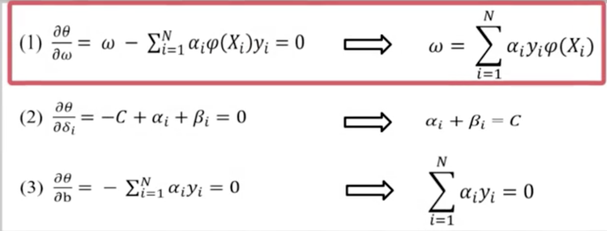 该问题是一个二次规划问题,要求θ(α,β)对最大值, 令 θ(α,β)对α,β,b进行求导并令导数为0,得到:
