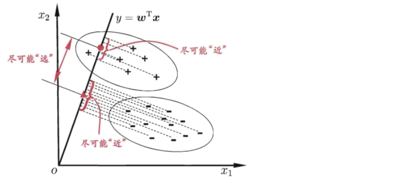 其基本思想是:将训练样本投影到一条直线上,使得同类的样例尽可能近,不同类的样例尽可能远。如图所示: