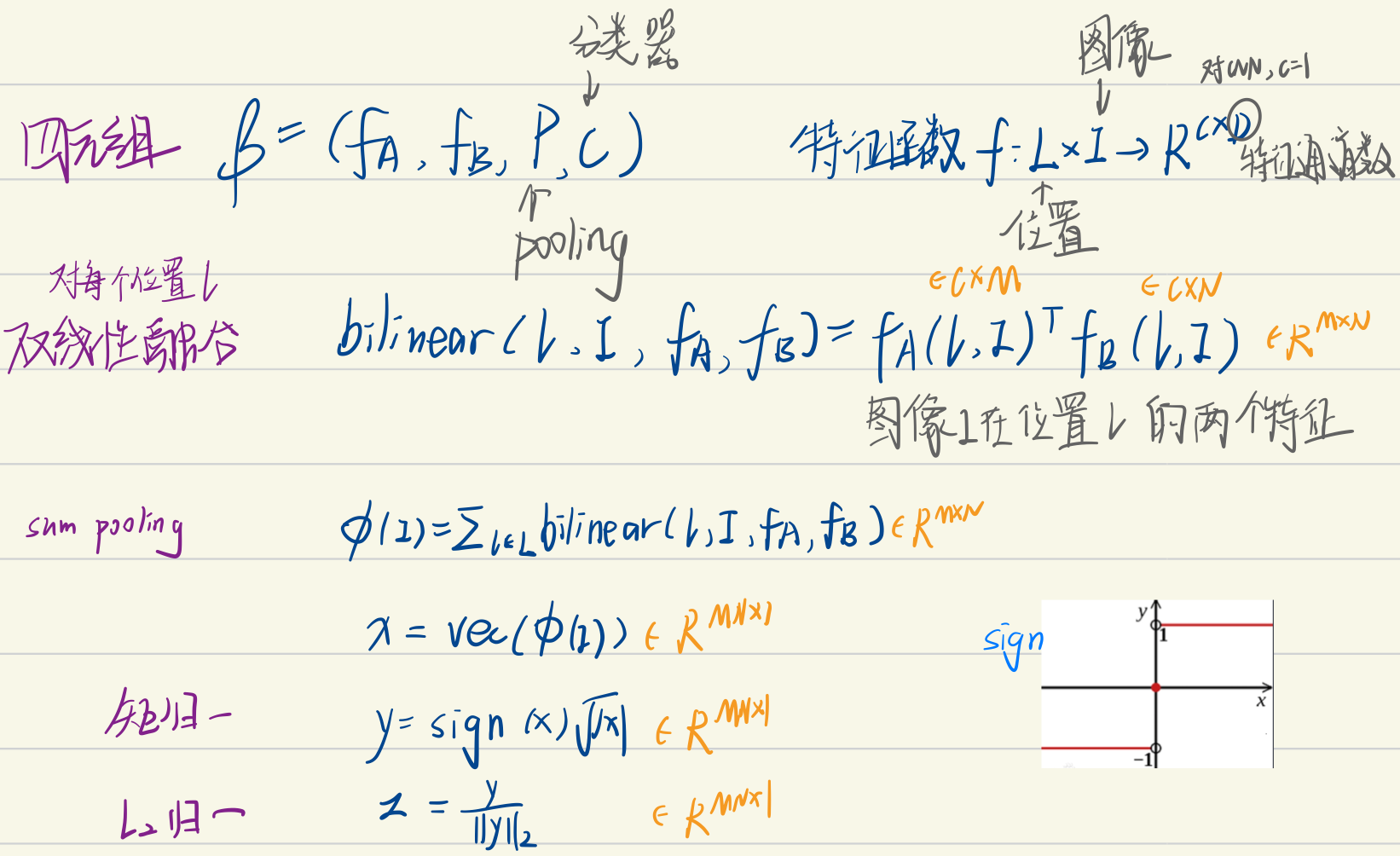sum/avg:只用了一阶信息。bilinear pooling 用了二阶统计信息,意在当一阶信息相同的时候利用二阶信息的不同来做分类。