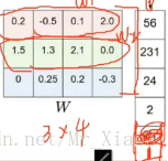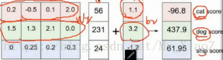 我们输入一个图像,拉伸后成为1维,为了方便,简单为4*1的向量,得分向量为3个分类,3*1,于是我们的W就要是一个3*4的矩阵,线性分类器嘛,有偏置项b(wile增加灵活性),最后我们得到y=W*x+b的线性函数(得分函数,y就是得分向量)。