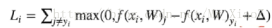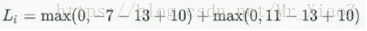 现在我们由三个类别,而得分函数计算某张图片的得分为f(xi,W)= [13,-7,11],而实际的结果是第一类yi=0,假设Δ=10(在正确的类别上的得分比错误上的类别高出至少10分),上面的公式把错误类别(j不等于yi)都遍历一遍,求值加和:
