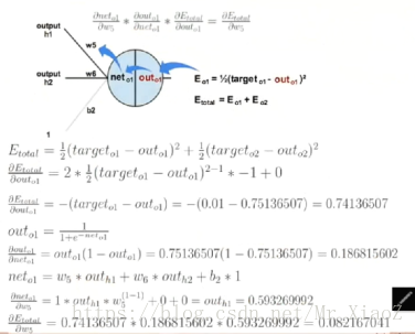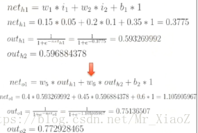 我们最开始并不知道我们的w和b到底是什么,所以我们随手敲了一组数,0.15,0.20,0.25,0.30和b=0.35以及后面的0.40...,然后开始做修正了。