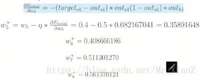 算出来E对于w5的偏导之后我们就可以使用SGD进行修正