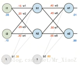 我们的输出是0.01和0.99,我们的输入是0.05和0.10,我们希望可以找到一组合适的w和b,来实现我们的输出目的。