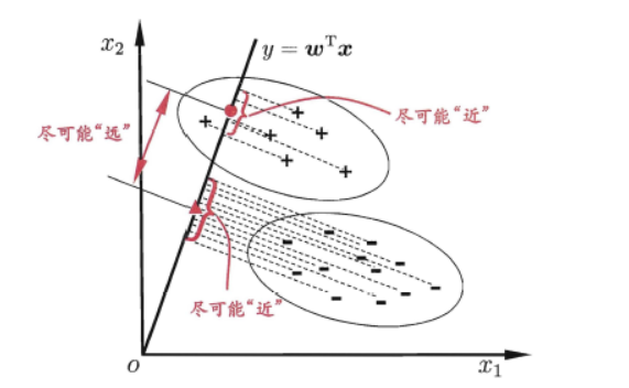 数学表达:极小化同类样例投影点的协方差;极大化异类样例中心之间的距离。