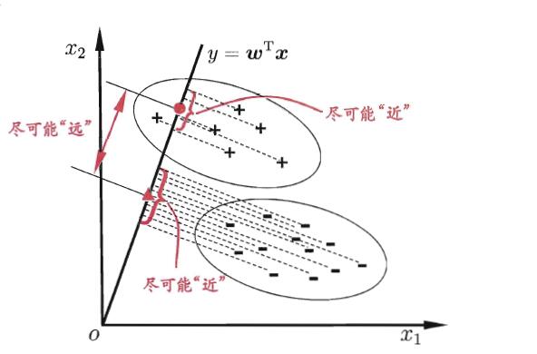 给定训练样例集,设法将样例投影到一条直线上,使得同类例的投影点尽可能接近,异类样例的投影点尽可能远离;在对新样品进行分类时,将其投影到相同的这条直线上,在根据投影点的位置来确定新样本的类别。