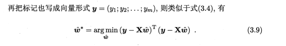 求解思路与一元线性回归任务基本一致,式(3.9)对w*(向量)分别求偏导,令其偏导数为零,就可以得到最好的w*(向量)。(具体求解推导过程会在下一篇更)