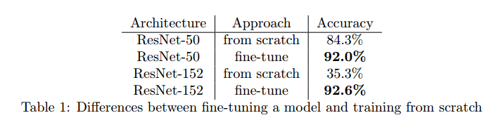 对于少量的数据集,迁移学习的微调相比于从头训练具有很好的性能。
