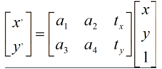 a表示图像坐标选择缩放等等仿射参数,t参数表示图像偏移信息量。有了这个(2,3)的仿射矩阵,就可以得到图像的空间变化坐标信息。