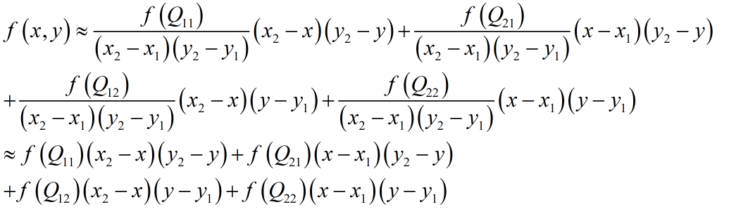 双线性插值,就是已知Q12,22,21,11的坐标的像素值,去求p点的像素值。其中公式如下: