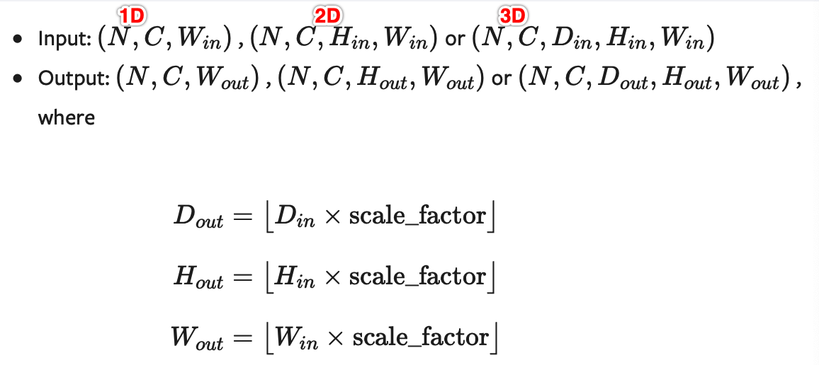 torch.nn.functional.interpolate(input, size=None, scale_factor=None, mode='nearest', align_corners=None, recompute_scale_factor=None)