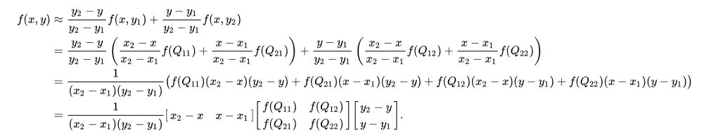 如果我们不知道 function f 上的点p(x,y)。但是我们知道f上其他的四个点。Q11 = (x1, y1), Q12 = (x1, y2), Q21 = (x2, y1), and Q22 = (x2, y2).