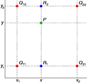 假如我们想得到未知函数 f 在点 P = (x, y) 的值,假设我们已知函数 f 在 Q11 = (x1, y1)、Q12 = (x1, y2), Q21 = (x2, y1) 以及 Q22 = (x2, y2) 四个点的值。