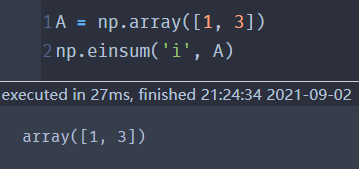 如果不指定'->'和输出标记,numpy会将输入标记中只出现一次的标记按照字母表顺序,作为输出标记(也就是 implicit mode)。