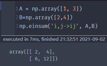 'i,j->ij':结果的第i行第j列,是A的第i个元素和B的第j个元素的乘积 |