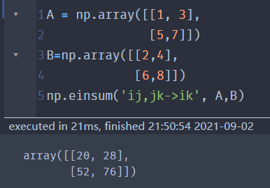 A = np.array([[1, 3, 5], [7, 9, -7], [-5, -3, -1]]) B = np.array([[0, 2,4], [6, 8, 6], [4, 2, 0]]) np.einsum('ij,jk->ik', A, B) ''' array([[ 38, 36, 22], [ 26, 72, 82], [-22, -36, -38]]) '''