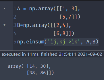 np.einsum('ij,jk->ik', A, B)字符串'ij,jk->ik'可以根据'->'的位置来切分,左边的部分('ij,jk')标记了输入的axes,右边的('ik')标记了输出的axes。