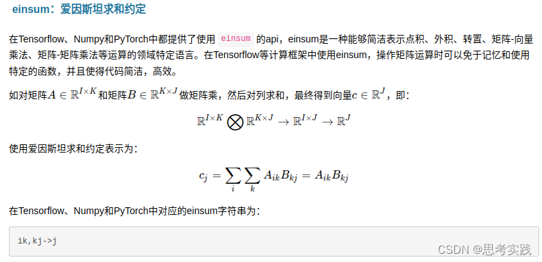 爱因斯坦求和~enisum~以及各种矩阵乘法product公式~最后有手绘enisum理解_小卜妞~的博客-CSDN博客 // 细节挺好爱因斯坦求和~enisum~以及各种矩阵乘法product公式~最后有手绘enisum理解_小卜妞~的博客-CSDN博客