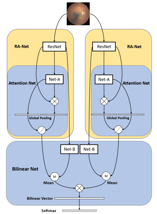 首先,将处理过的图像进入ResNet进行特征提取;然后应用注意力网集中于可疑区域。对于该任务中的细粒度分类,采用双线性策略,同时训练两个RA-Net以提高分类性能。正因为如此,我们的架构被命名为“BiRA-Net”。