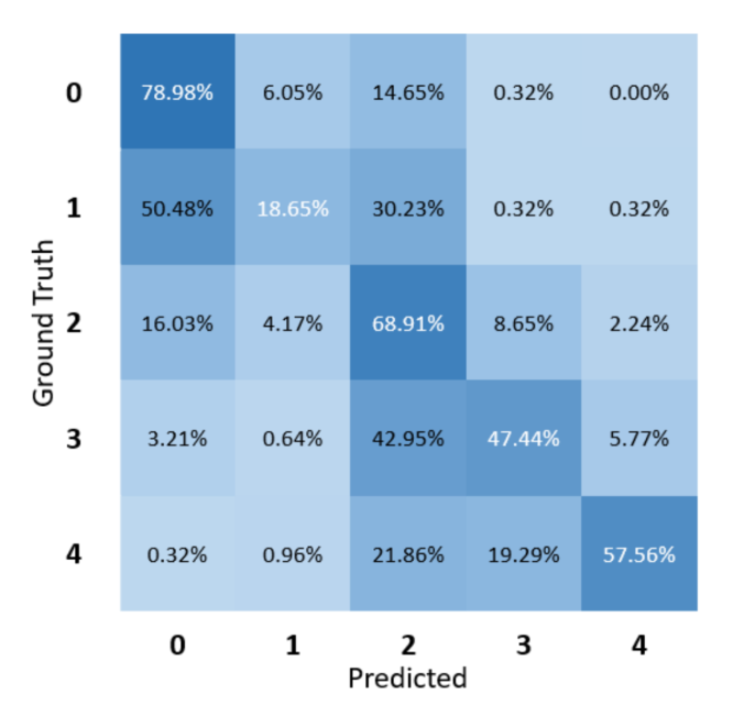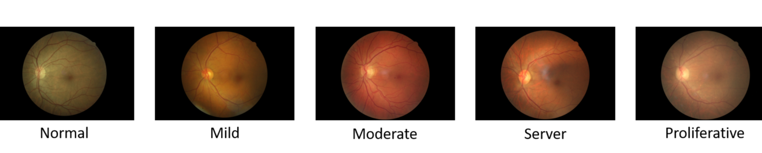 数据分布情况:本文使用Kaggle的数据集进行了实验。视网膜图像由由35126张图像组成的眼球图像提供。根据疾病的严重程度,每张图像都被标记为{0、1、2、3、4}。每个类的例子如图所示。3.数据集高度不平衡,具有25810级0级图像(正常)、2443级1级(轻度)、5292级2(中等)、873级3(服务器)和708级4(增殖)。为了更好地泛化和与最新的五类分类方法进行比较,采用了[16]的数据分布,然后我们保留了1560张平衡图像进行验证,其余用作训练数据。