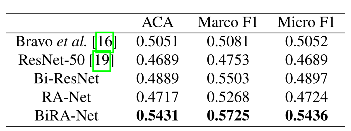 BiRA-Net在ACA、MarcoF1和MicroF1中的表现优于所有其他方法。我们还使用交叉熵损失实现了BiRA-Net,并取得了具有竞争力的结果。ACA为0.5424,接近我们提出的BiRA网。然而,利用所提出的损失,我们观察到一个改进的收敛速度。