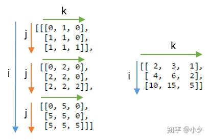 np.einsum('ij,jk->ijk', A, B),注意此时的输出是三维的ijk,根据下图推测出计算方式是:用第一个矩阵i维度上的三个向量,即j向量,分别乘第二个矩阵沿着j方向的整个矩阵。