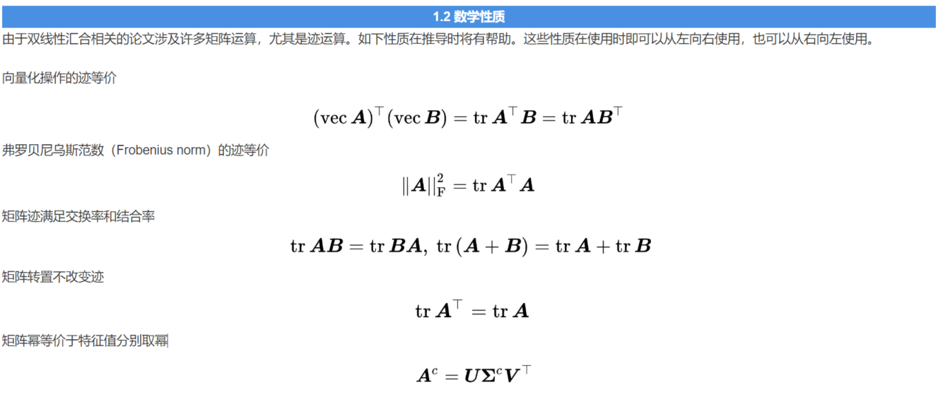 由于双线性汇合相关的论文涉及许多矩阵运算,尤其是迹运算。如下性质在推导时将有帮助。这些性质在使用时即可以从左向右使用,也可以从右向左使用。
