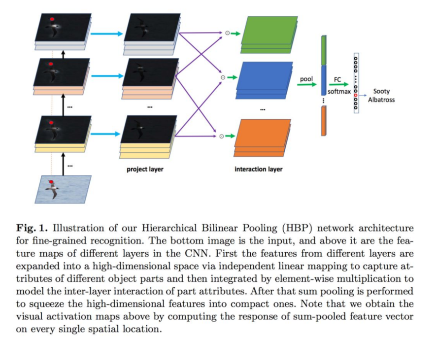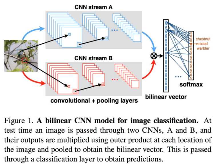 细粒度图像分类旨在同一大类图像的确切子类。由于不同子类之间的视觉差异很小,而且容易受姿势、视角、图像中目标位置等影响,这是一个很有挑战性的任务。因此,类间差异通常比类内差异更小。双线性汇合(bilinear pooling)计算不同空间位置的外积,并对不同空间位置计算平均汇合以得到双线性特征。外积捕获了特征通道之间成对的相关关系,并且这是平移不变的。双线性汇合提供了比线性模型更强的特征表示,并可以端到端地进行优化,取得了和使用部位(parts)信息相当或甚至更高的性能。