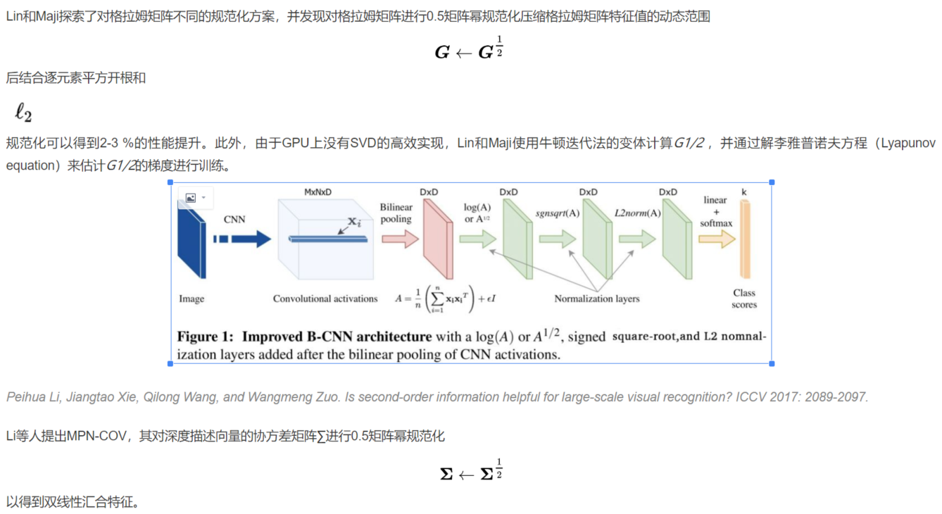 - 双线性汇合结果的规范化。目前发现矩阵幂规范化对提升性能很有帮助,是否还有其他规范化方法,以及能否设计出其在GPU的高效实现?