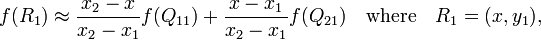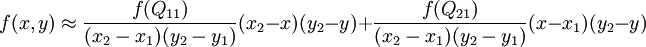 假如我们想得到未知函数 f 在点 P = (x, y) 的值,假设我们已知函数 f 在 Q11 = (x1, y1)、Q12 = (x1, y2), Q21 = (x2, y1) 以及 Q22 = (x2, y2) 四个点的值。